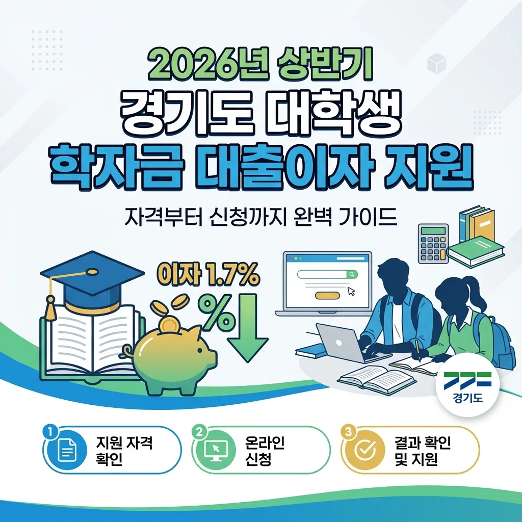 2026년 상반기 경기도 대학생 학자금 대출이자 지원 사업은 2025년 하반기에 발생한 한국장학재단 학자금 대출 이자를 지원해요. 경기도 거주 요건, 소득 기준(8분위 이하 또는 다자녀), 졸업 후 일정 기간 이내의 미취업 졸업생 등이 지원 대상이며, 신청은 2026년 1월 2일부터 2월 13일까지 경기민원24를 통해 온라인으로 가능해요. 지원금은 대출 계좌에서 원리금이 차감되는 방식으로 지급되며, 중복 지원은 불가해요.